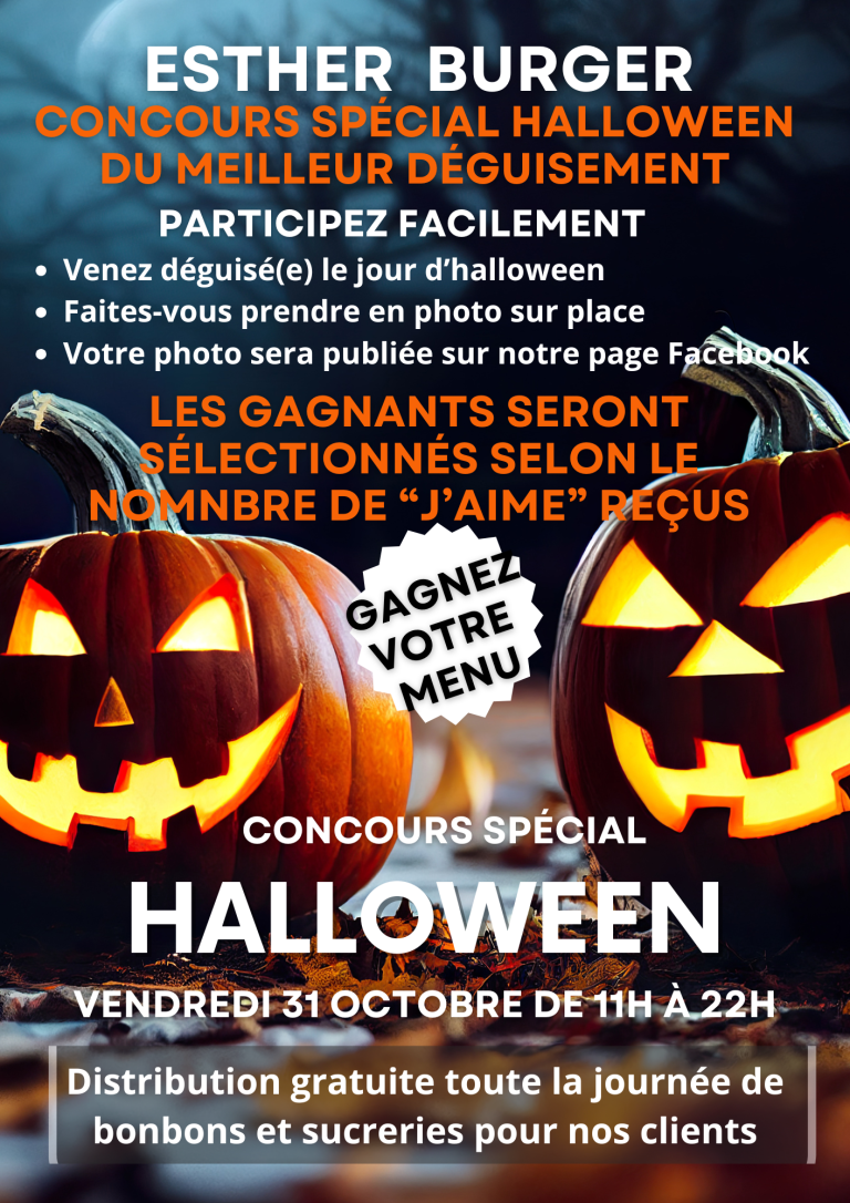 Vendredi 31 octobre de 11h00 à 22h00, concours du meilleur déguisement pour remporter des menus, pour enfants et adultes.